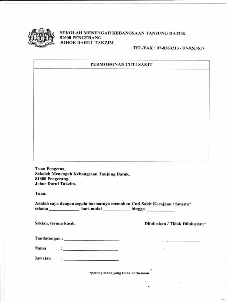 Berikut disertakan contoh surat rasmi memohon cuti daripada pihak sekolah sekiranya pelajar tidak menghadirkan diri ke sekolah tanpa sijil sakit ataupun atas alasan lain yang kukuh atau munasabah. Untuk itu kami akan memberikan jawaban dan contohnya merupakan ketidakhadiran yang diajukan seorang karyawan ketika dalam kondisi sedang sakit. Terlebih untuk urusan komunikasi pribadi, misalnya. Dalam hal ini jumlah cuti tidak terdapat jumlah yang. Sekolah surat, sekolah kerana sakit, sesi persekolahan, nama anak, kerana sakit perut, atas urusan kematian.