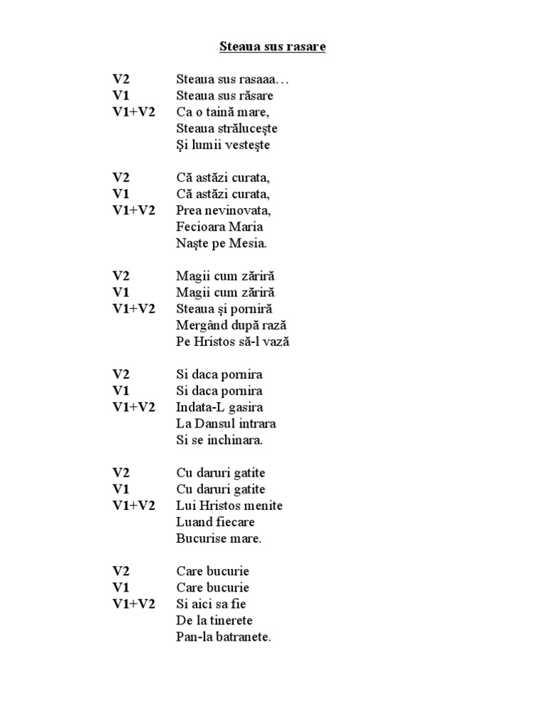 Steaua sus rasare ca o taina mare, steaua straluceste si lumii vesteste. Ca astazi curata, prea nevinovata, fecioara maria naste pe mesia. De la naşterea lui hristos. Steaua sus răsare colinde de iarnă pentru copii tralala. Steaua sus răsare ca o taină mare steaua strălucește și lumii vestește și lumii vestește. Care bucurie si aici sa fie, de la tinerete pan' la batranete pan' la batranete. Ana maria fusu bianca hall vasil chekardzhikov. Steaua sus rasare cantece de craciun pentru copii. Colind prezentat de cei mai mici ai parohiei ortodoxe ghidighici: Steaua sus rasare ca o taina mare, steaua straluceste si lumii vesteste si lumii vesteste. Изгряваща звезда като голяма мистерия звездата свети и светът обявява и светът обявява. Colind steaua sus rasare interpretat cu ocazia sarbatoririi nasterii domnului in cadrul serviciului divin din 7 ianuarie 2014. Download and print in pdf or midi free sheet music for steaua sus rasare by ioan d.